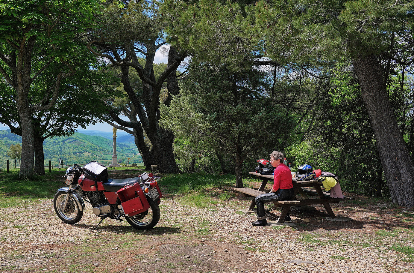 Ansouis ist eine kleine historische Stadt am Südrand des Luberon in der Provence. Wir hatten unsere SR in den Peugeot geladen und sind die 1000km dorthin in einem Rutsch, einfach zu fahren, Ausfahrt A7 Cavaillon und dann noch ca. 50km nach Ost-Südost. Die Unterkunft war klein und gemütlich, wir hatten etwas Augenmerk gelegt auf morgendliche Lizenz zum Anrollen für unsere betagte SR, das spart Energie und Nerven, über Tag kam sie dann warm immer auf den ersten Tritt. Ein weiterer Grund für Ansouis ist die gute Ausgangslage für Tagestouren in alle 4 Himmelsrichtungen, und so fuhren wir 250-300km pro Tag, wir hatten das Logis für eine Woche. Tag eins brachte uns auf die Südseite der Lure, die kleine Schwester des Mt. Ventoux, das Plateau von Valensole und den unteren Verdon mit dem Stausee von Esparron, in der Saison schwer zu ertragen, aber landschaftlich Spitze. Hoch über Riez ist die Kapelle St. Martin, dort ist Ruhe und ein traumhafter Rastplatz, ganz für die Seele. Bis zum Mittelmeer ist es nicht weit, und eine Genussfahrt mit 75kmh durch die Camargue ist fast ein Muss, die Route du Cacharel, für mich die schönste Strasse in der Camargue, nach les Saintes Maries de la Mer, dort war schon reger Badebetrieb. Wir legen die Strecke so, dass wir über die Alpillen müssen, vermeiden aber les Baux. Zwischen dem kleinen interessanteren westlichen Luberon und dem höheren östlichen Luberon ist dieser kleine Einschnitt zwischen Lourmarin und Bonnieux, immer ein Bild wert. In Lourmarin ist das Grab von Albert Camus und unauffälliger kann kein Promi-Grab sein, Camus liegt hinten links. Für das Felsriff von Sainte Victoire fehlte ein wenig die Sonne, Cézanne hätte sie malerisch beigetragen, wir haben so dort den Thymian gepflückt für das abendliche Mahl. Eingeborene bestätigten uns, dass es noch selten ein so grünes und blütenreiches Frühjahr gab, die Provence hatte viel mehr Regen im Frühjahr als wir hier. Das Département Var ist ansonsten mit das Knisternste da unten, g...ute Moppistrecken, im Bereich Rians - Draguignan, fast kein Verkehr, keine Passbildautomaten über Land, nun fahren wir da nicht zum Rasen hin, aber -F- darf von hinten blitzen und die Tarife sind anders als bei uns. Die Felswand von Lioux ist immer wieder auf unserem Programm, nicht sonderlich bekannt, nicht gehyped, keine Souvenirshops, das ist einfach ein grandioses Monument, ebenso wie die Schlucht der Nesque, nicht so bekannt wie Tarn oder Ardeche, mehr eine Perle im Verborgenen, und in Villes sur Auzon ist ein total knuffiger kleiner Campingplatz. Wir sagen Adieu mit einem Bild vom Windberg. Grüsse aus der Eifel Alexandra & maro |