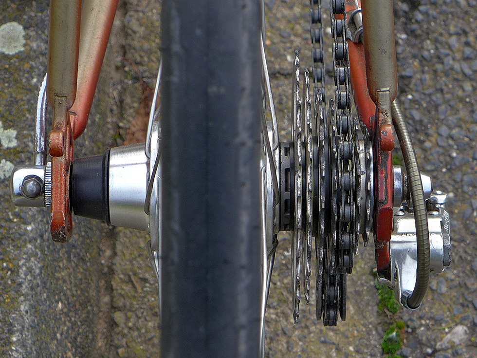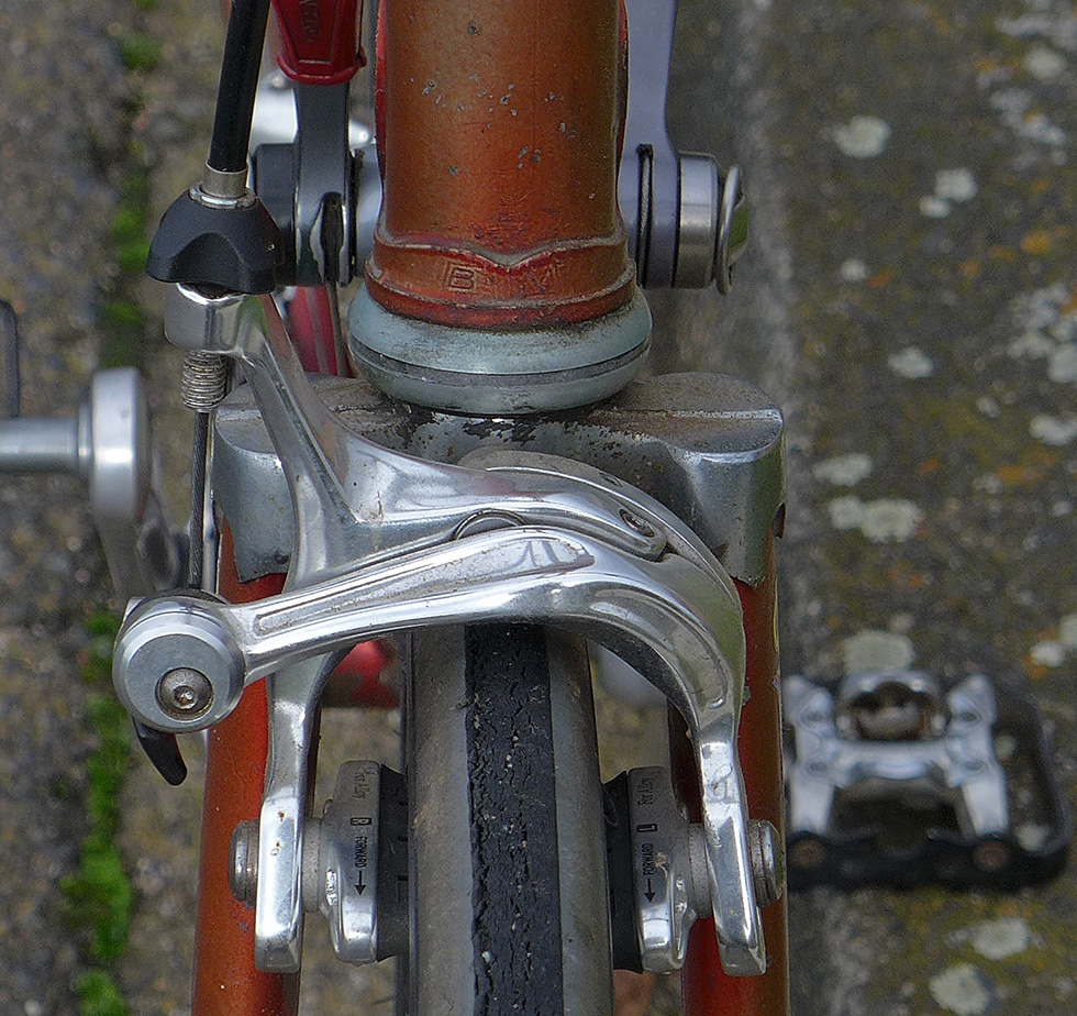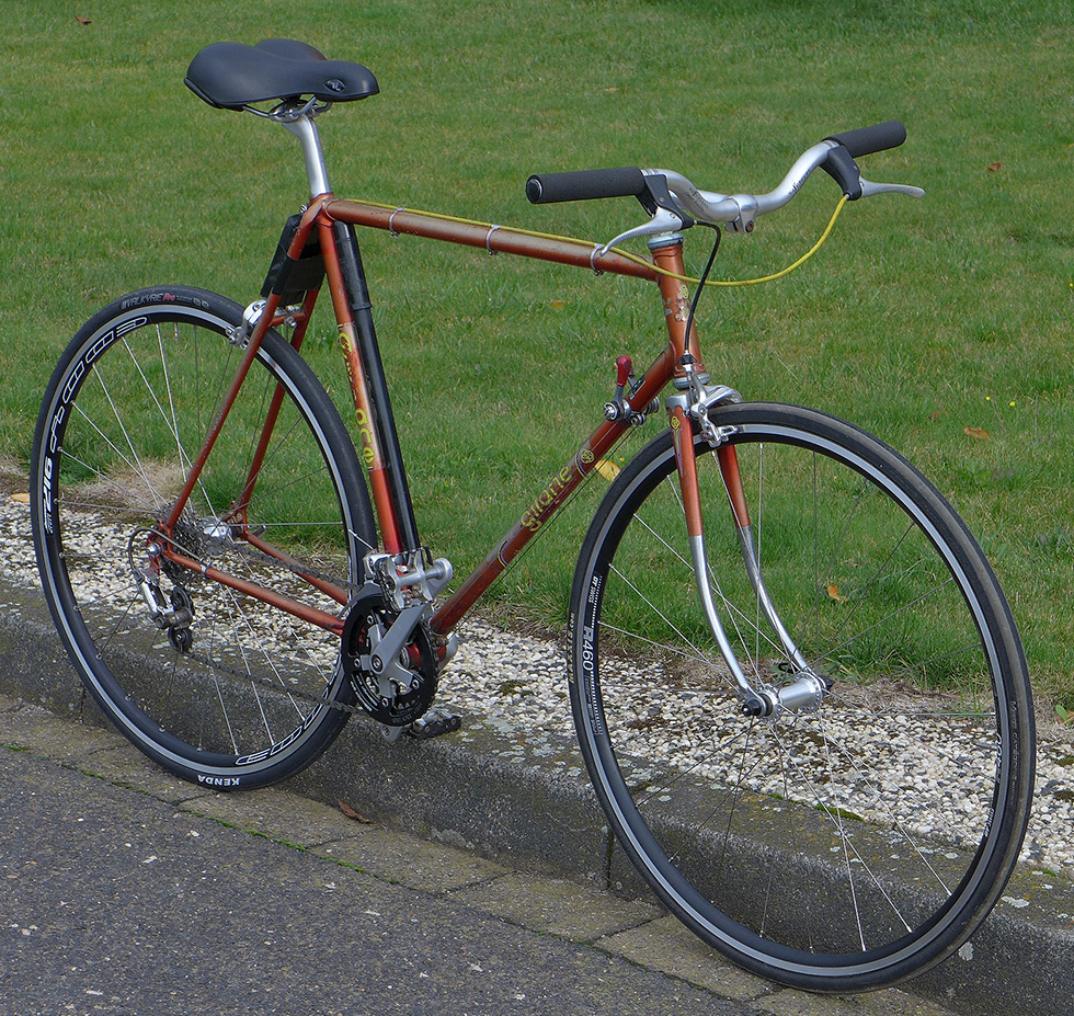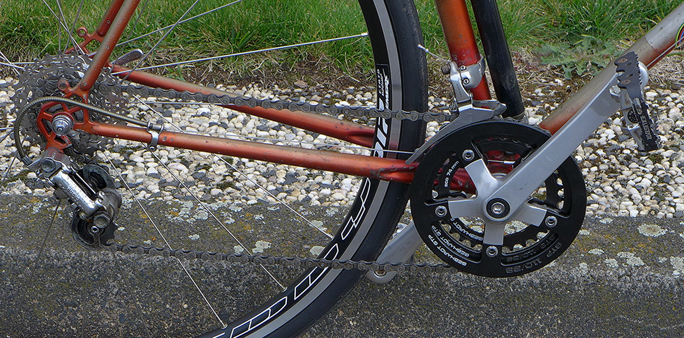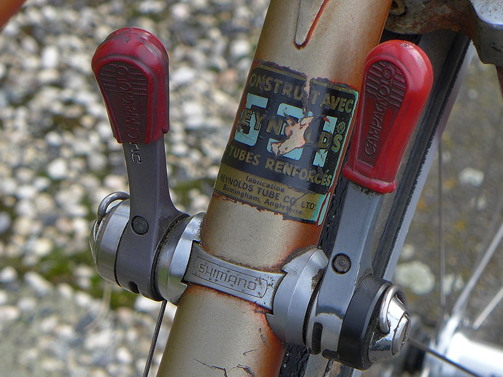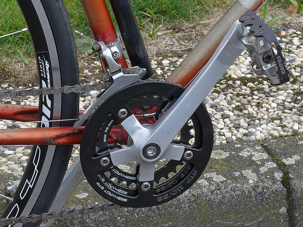 | es begann damit, dass ich vor ca. 25 Jahren auf meiner abendlichen Radrunde durch den Ort Langendorf kam und an einer Hauswand stand Spermüll, mit 2 Rädern, da musste ich einfach anhalten. Der Zustand war schlimm, aber ich sah oben auf dem Unterrohr diesen grünen Kleber: 531. Wer macht denn so etwas? Aus meiner Jugend kannte ich das Vorgehen bei Fahrradüberführungen: eine Hand am Lenker des Rades unter dir, die andere Hand bewegt das zu transportierende Rad... bis aus dem Ort hinaus, da war eine buschig bewachsene Böschung am Rand der Neubaustrecke, in dieses Gebüsch habe ich die Gitane 531C geworfen, am nächsten Tag mit dem Kastenwagen wieder hin, ausgegraben und nach Hause geholt, ins neue Heim. Das war der Beginn einer dauerhaften Beziehung. In meiner Restekiste hatte ich noch diese verchromten Kabelführungsschellen von Camp, eine Record 24L Hochflansch-HR Nabe, ein Gran Sport Schaltwerk, einen ETA-Steuersatz aus der Zeit, eine DA-Stütze, nicht ganz stilecht, einen braunen Rolls-Sattel, der inzwischen dem Zeitfortschritt weichen musste, einen Cinelli-Vorbau, und 7400er SIS-Rahmenhebel. Dann das Unerwartete: die 7400er Rahmenhebel harmonierten perfekt mit der Gran Sport und dem Sechsfach-Schraubkranz! Rastschaltung mit einer Nuovo Gran Sport, als Rastschaltung noch gar nicht da war! Den originalen Antrieb habe ich vergessen, Ofmega oder so was? Die Räder habe ich neu gemacht, natürlich waren da Klebereifen drauf mit zu vielen Speichen und grottiger Stabilität, zu wenig Felgenhöhe, wie damals üblich. Für über 20 Jahre war das bei mir das "Bahnhofsfahrrad", zum Briefkasten und zur Bank, Auszüge ziehen. Parallel hatte ich immer einen "richtigen" Renner. Wir fahren mit der Gitane zu zweit gemütliche Runden mit 10-20km, um nicht einzurosten, und 150 Höhenmeter reichen vollauf. 25mm Reifen mit 6 bar statt Igelschneider mit 9 bar, der Sattel ist mehr ein Sofa, der Lenker flach mit Moosgummis. Aber der Kern bleibt: eine Gitane mit fantastischer Geometrie, geht ums Eck wie blöd, hat breite Raddurchläufe, und Reynolds 531 läuft zwar an Lackfehlstellen an, rostet aber nie so gruselig wie Colombus SL. Zu diesem Seniorenrad habe ich einen Laufradsatz 24x24 Speichen gebaut (Logo) und eine HR-Nabe für 7fach Kassettenfreilauf, wegen der Logistik, das bekommt man schön schmal und fast symmetrisch, mit einer Kassette viele gemütliche Kilometer, auch flott bewegt, wünscht maro moskop |