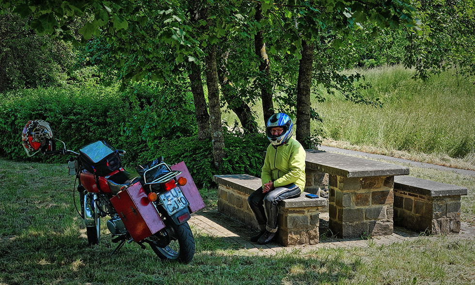 Anfang Juni, lange Tage, nicht zu heiss, kein Niederschlag in Sicht - ab aufs Moppi und nach Nordfrankreich. Durch die Ardennen, da laufen schön kleine aber weit tragende Strecken nach West-Südwest, so ist da die Landschaft gefaltet, N929 oder N938. Ein Highlight ist immer, ein Stück Maaslauf mitzunehmen. Der Sprit ist derzeit in -B- sehr günstig,