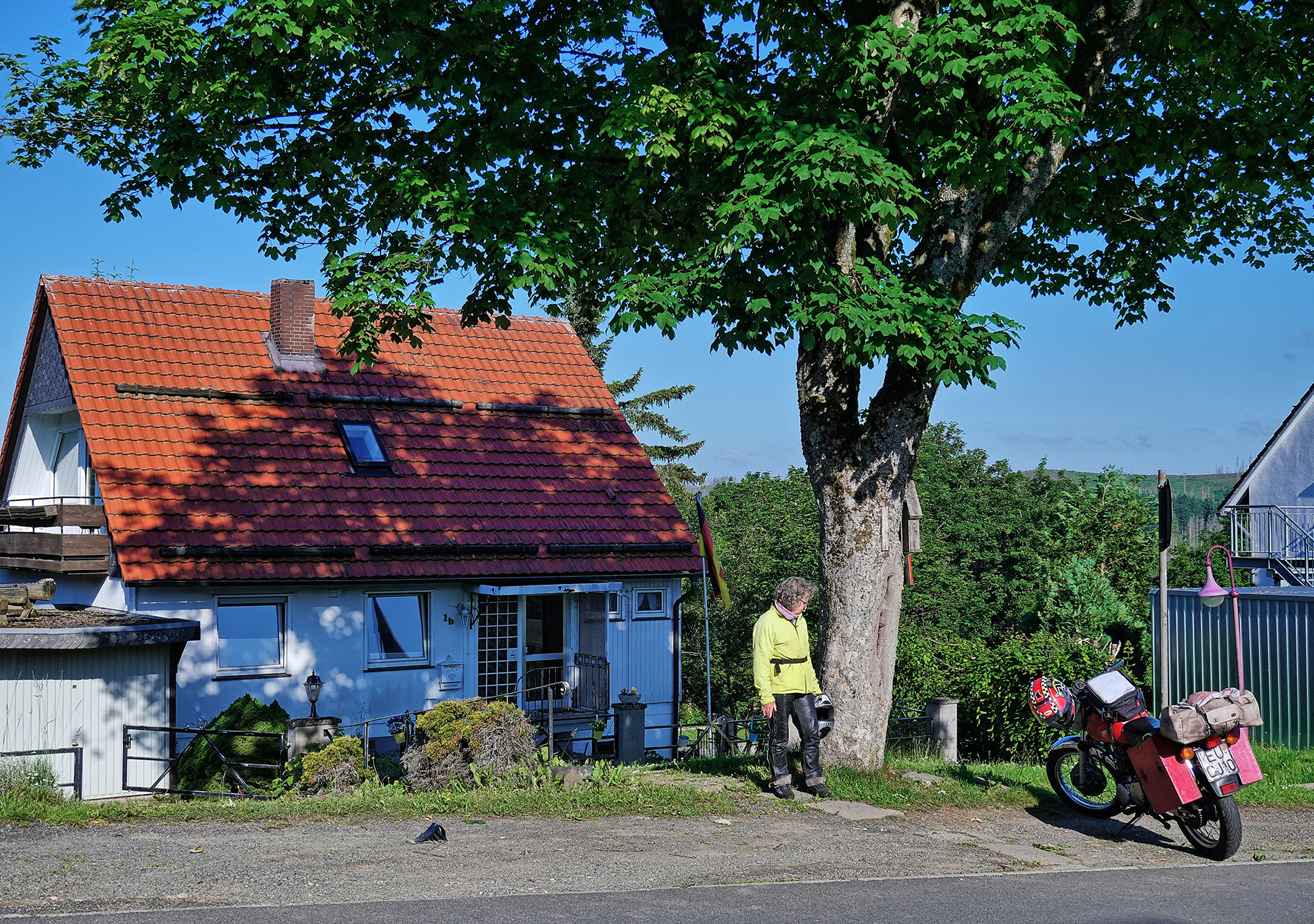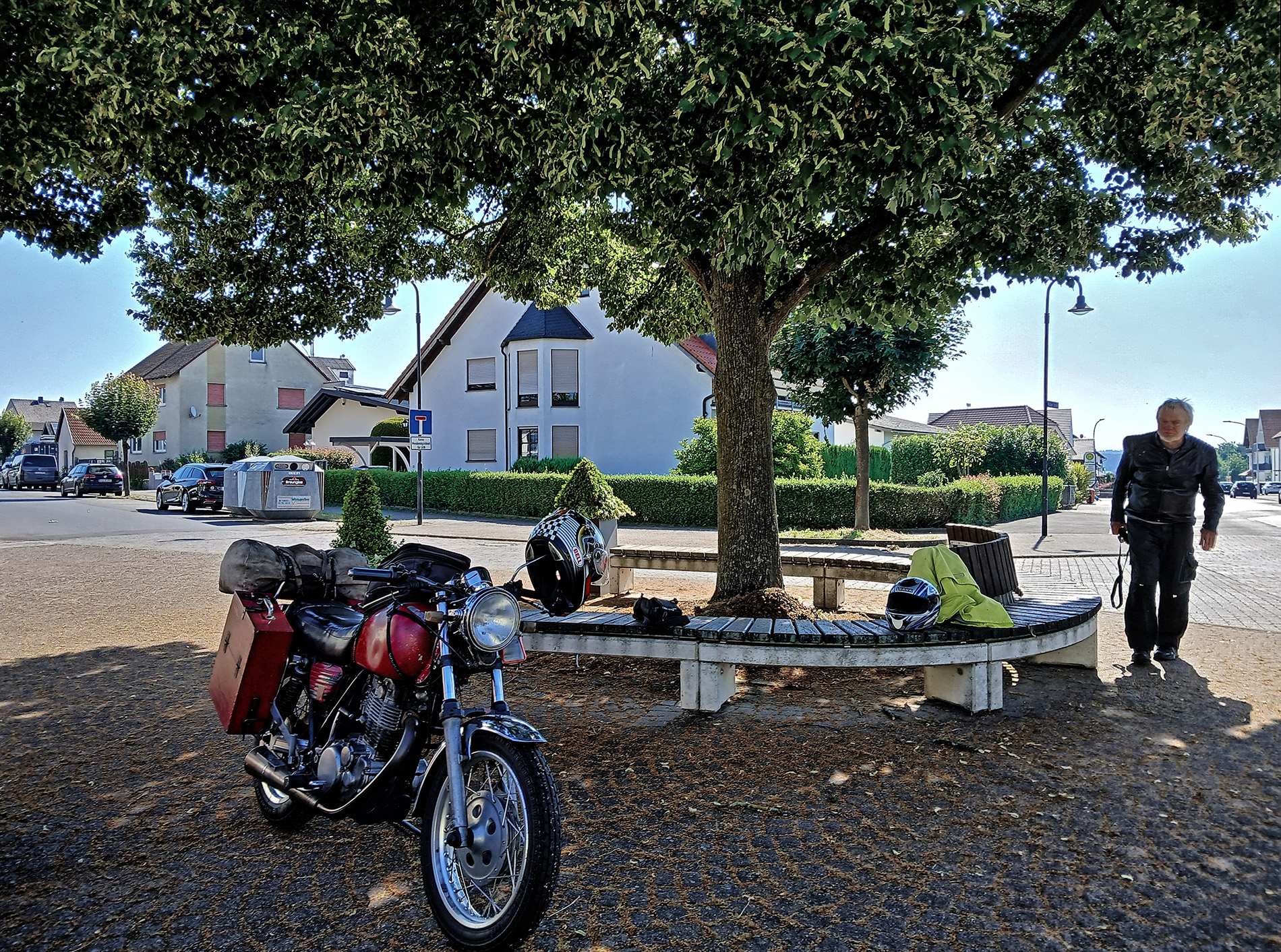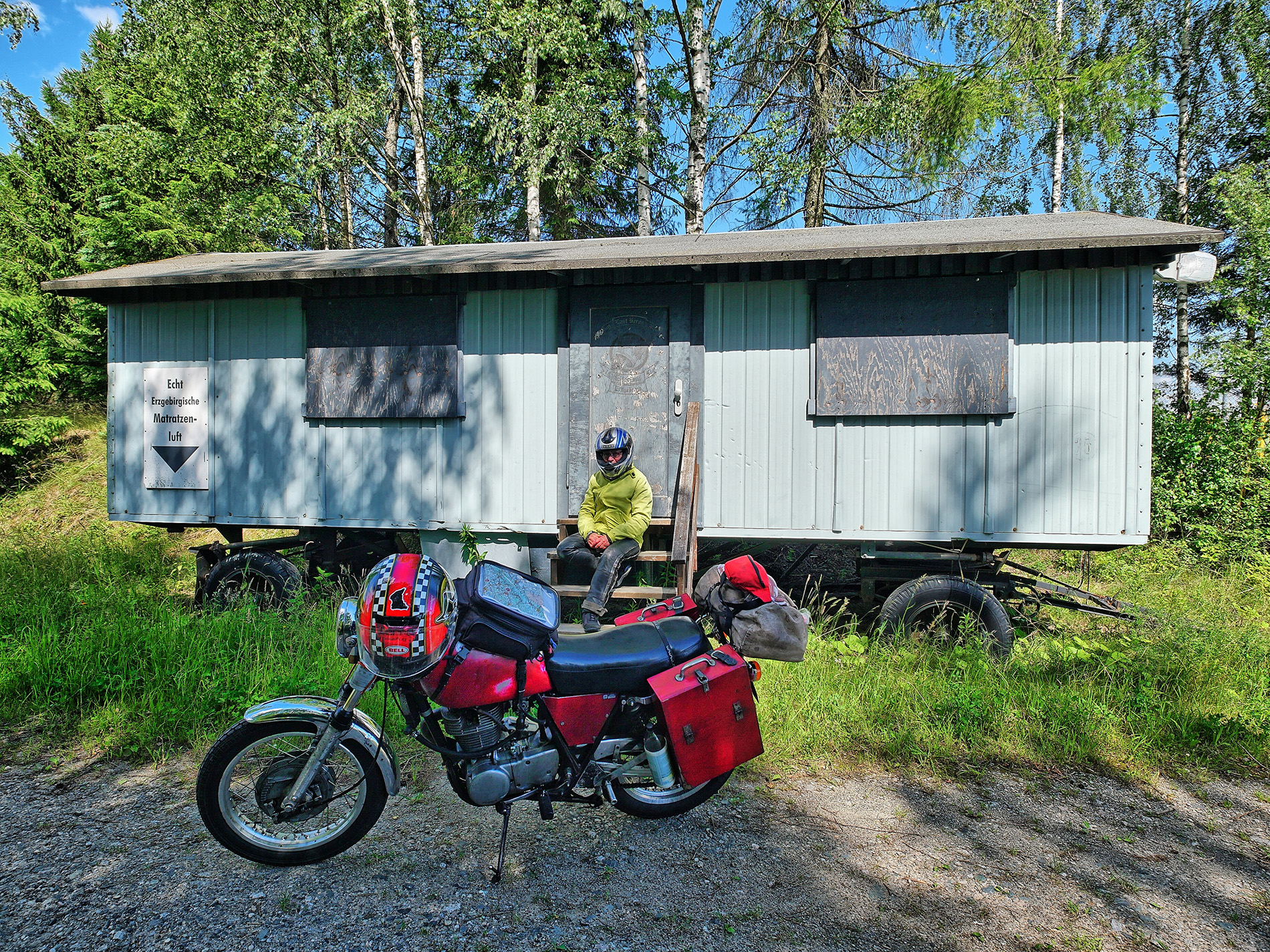 Start in der Nähe von Euskirchen, von da über den Rhein nach Osten. Das Tal der Bröl entlang der B 478 ist malerisch und kurvig. In der Verlängerung führt es uns bis zur A4 südlich von Olpe, Gerlingen. Die A4 nutzen wir nur taktisch, um schnell aus dem Loch zu kommen und über den Hügel zu hüpfen. Die B54 / 517 bringt uns nach Kirchhundem, der Basisstation für das Rothaargebirge, das sind Moppistrecken vom Feinsten. Bad Berleburg liegt schon an der Eder, für Rheinländer ist das fast Ostblock, aber schön! Frankenberg an der Eder hat eine feine Altstadt, um die man natürlich herumgeleitet wird, die möchten Ruhe, verständlich. Weiter über Fritzlar, Melsungen und Eschwege in den Hainich und nach Mühlhausen. Das sind alles gute Strassen mit Kurven und wenig Verkehr. Von Nordhausen am Südrand des Harzes sind wir in ein Dorf bei Braunlage zum Schlafen, Klasse Unterkunft. Wir waren zuvor in der Gegend, und die Konstellation der Orte Sorge und Elend hatte es uns angetan. Ja, da gibt es nicht viel zu verdienen und die Situation der Wälder ist so katastrophal, das habe ich in den letzten 30 Jahren nicht gesehen, da bringt selbst das Holz kein Geld mehr. Kommt in die Eifel, bleibt nachts liegen, und ruft Euren Freund an: hole mich hier raus, ich liege zwischen Weibern und Engeln. Nix Sorge und Elend. Der Südostharz ist trocken und lichtdurchflutet, in Sangershausen stiessen wir auf die B180, die uns eine weite Strecke nach Südost getragen hat. Eine Perle ist Freyburg an der Unstrut, da kommt der Rotkäppchensekt her, leckerer Ost-Champagner. Die weitere B180 ist dann etwas zäh, bis man den Nordrand des Erzgebirges erreicht. Der Nordrand des Erzgebirges ist ein Traum, Annaberg-Buchholz, Jöhstadt, Olbernhau, das sind teilweise Märchenlandschaften. In Deutschneudorf gibt es einen Grenzübergang über den Bach nach CZ, den Viamichelin nicht kennt, der aber eine Super-Abkürzung ist nach Osten. Wir dachten: da MUSS es etwas geben, google maps zeigt das, wenn man richtig reinzoomt. Wir hatten eine Unterkunft südlich von Teplice als Ziel, und dafür hat uns das sehr geholfen. In Teplitz noch schnell Betriebsstoffe eingekauft und getankt, dann auf einen Bauernhof mit Caravan im Garten. Die CZ - Südseite Erzgebirge ist total zwiegespalten: weiter unten die Braunkohle-Industrie von Most und Chomutov, in den Südhängen verschlafene Landschaften, die ganz schlecht von Ost nach West durchfahrbar sind, also die Autobahn nehmen, das ist dort stressfreier, als sich durch die Gerwerbegebiete zu schlängeln. Ab Chomutov geht die N7 effektiv nach Nordwest bis oben auf den Höhenzug, g...ute Streckenführung, und dann links abbiegen auf die N 223 nach West, und von der gesamten Tour empfanden wir das als das schönste Stück, bis Oberwiesenthal zur Grenze. Der Abstieg vom Fichtelberg nach Westen liefert sagenhafte Blicke nach Westen. In Oelsnitz sind wir aus taktischen Gründen auf die A72 nach Südwest, um Hof schnell hinter uns zu lassen, durch den Frankenwald zur Rhön, weiter zum Vogelsberg, in Schotten gaaaanz langsam gefahren, wir mögen keine Rennen. Obwohl keine BAB-Freunde, die A45 bringt einen sehr ökonomisch nach Nordwesten, da ist dicht besiedeltes Gebiet und die Hessen lieben Verkehrüberwachung, dann lieber A45 bis Herborn. Der Weg über den Westerwald, die Fuchskaute, war ruhig, kühl und glatt, bis nach Hennef, da tauchten wir in Verkehr und Hitze ein, aber wir waren ja schon fast da. Im Sommer ist das für uns auch immer ein Spiel mit den Temperaturen, mit einer wassergekühlten Möhre und E-Starter machst Du bei einem unkalkulierbaren Halt wg eines Unfalls einfach die Kiste aus. Mit einer SR musst Du immer abwägen: Kiste ausmachen und nach 5min Probleme beim neu-Starten oder laufen lassen und das Öl wird mal eben 20 Grad heisser, obwohl es schon im oberen Bereich ist ? Aber wir möchten uns nicht beschweren, die SR ist eine tolle Kiste fürs Motorrad-Wandern. Grüsse aus der Eifel A & m |