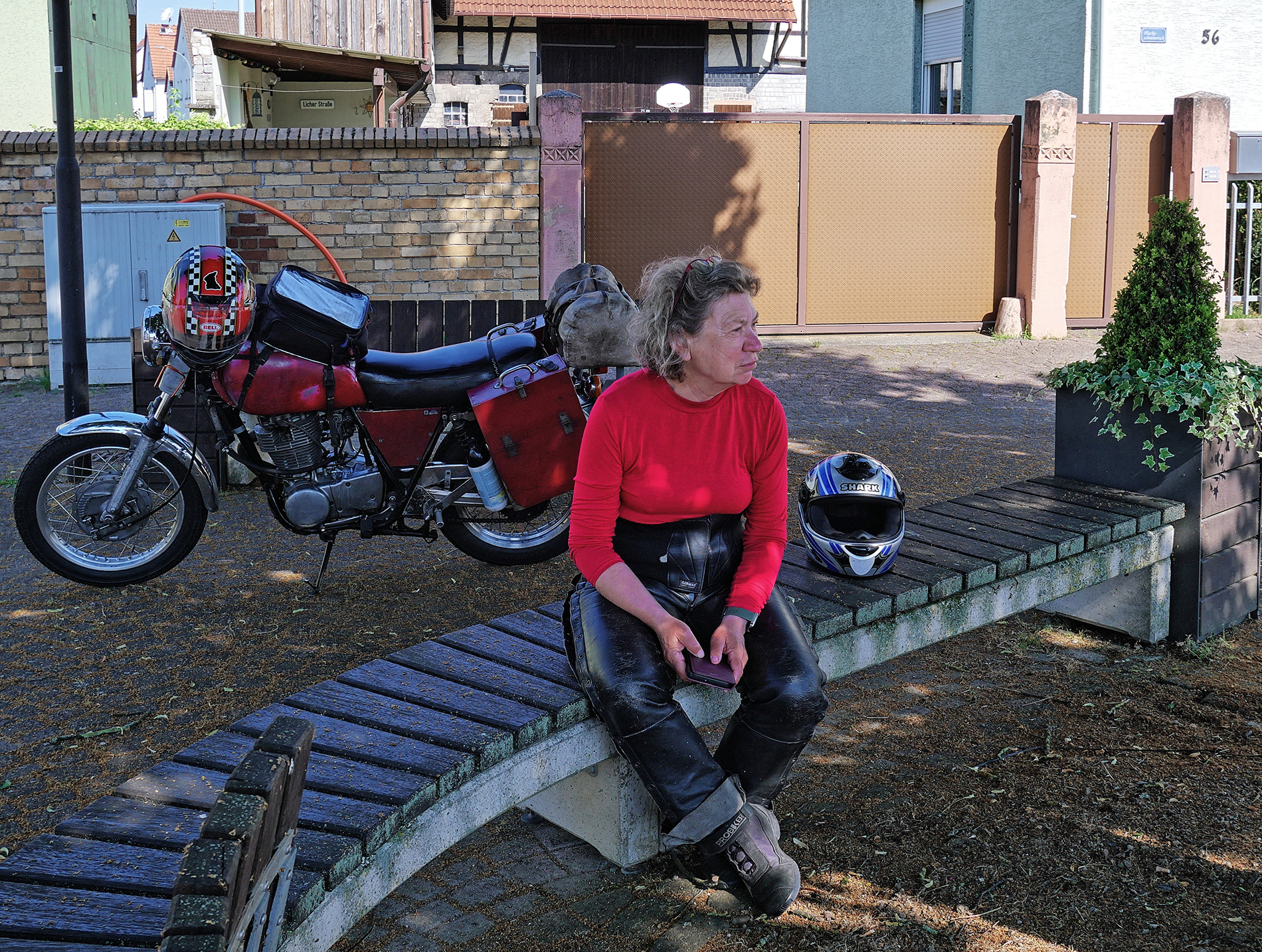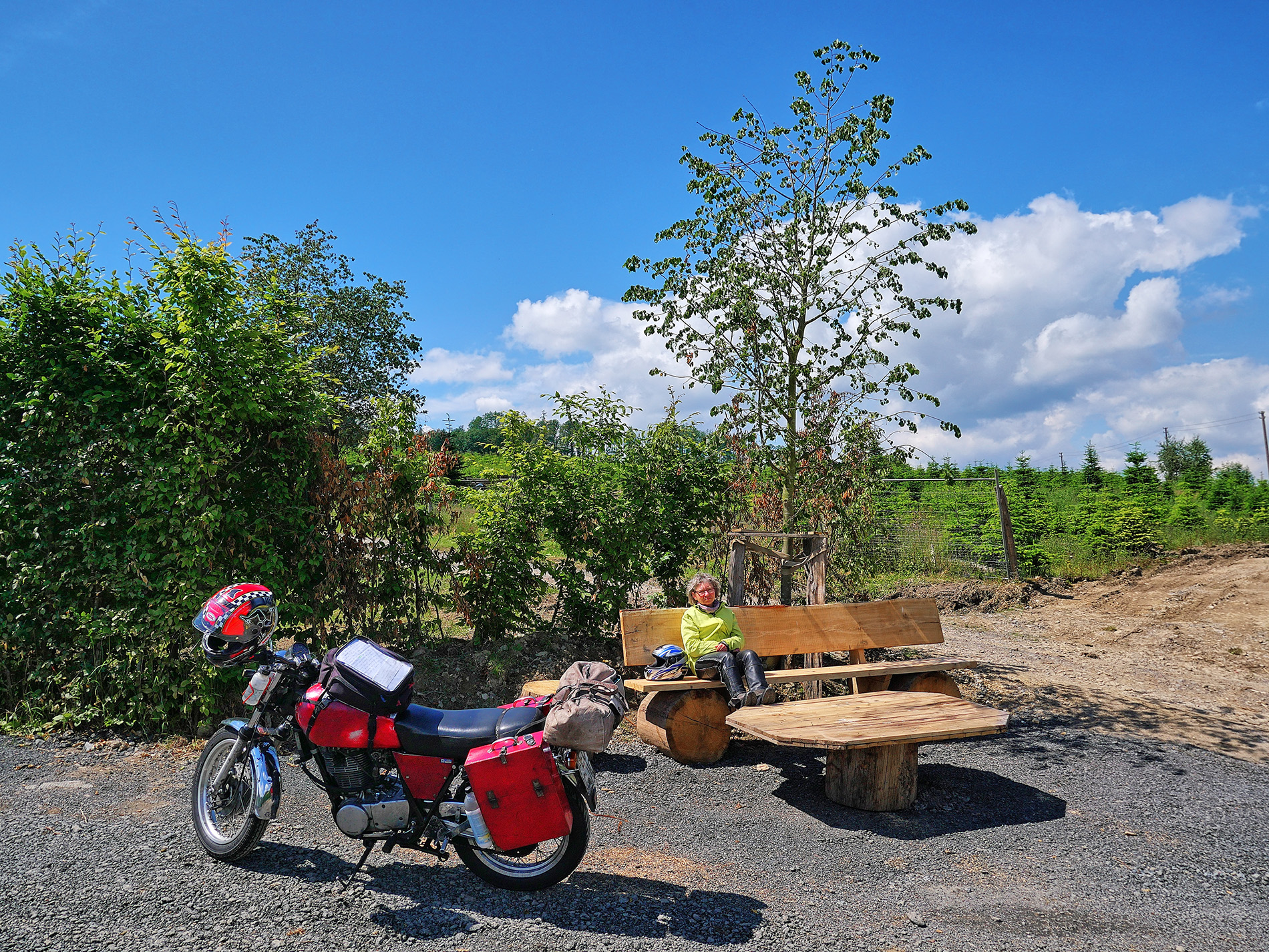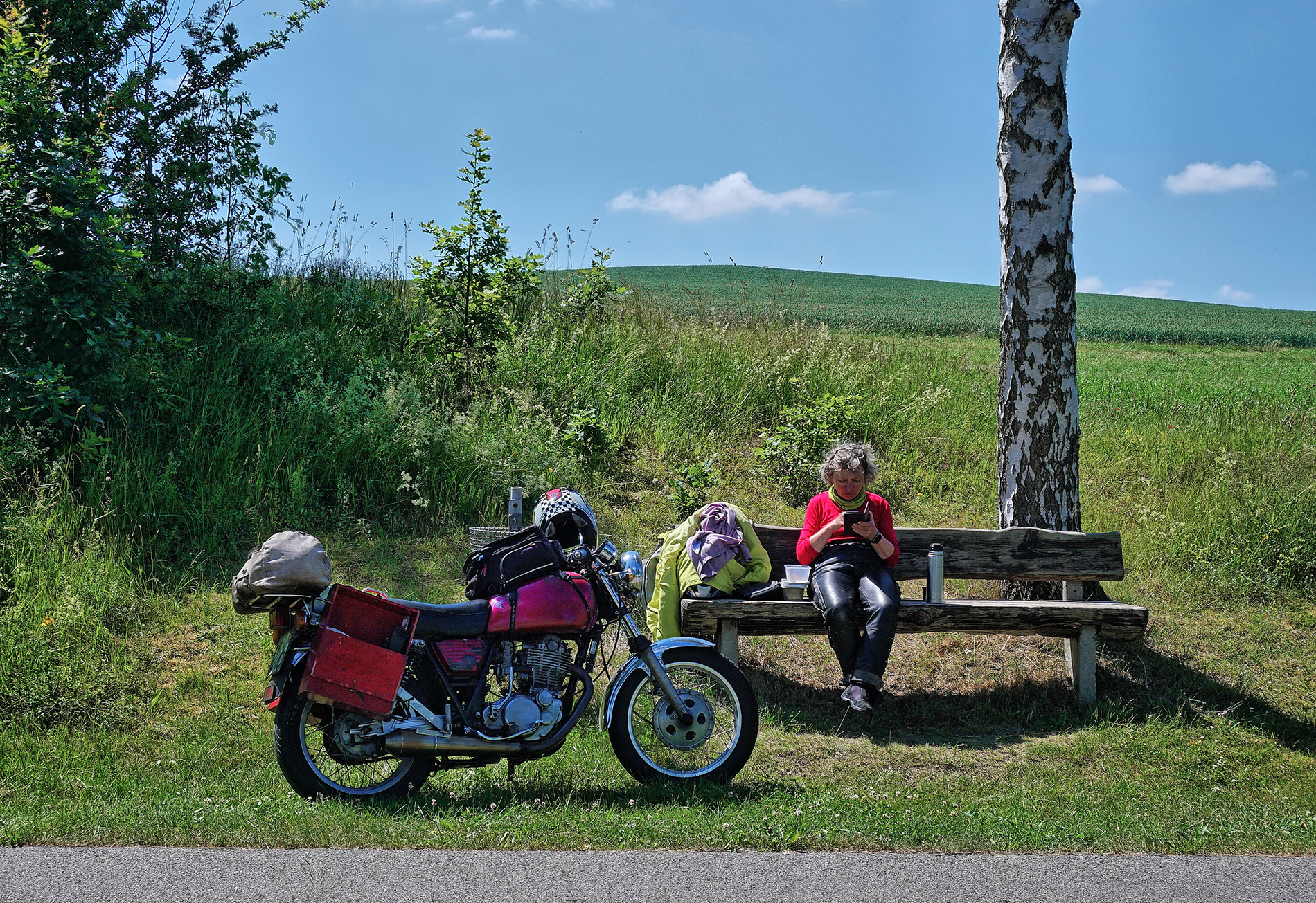 Start in der Nähe von Euskirchen, von da über den Rhein nach Osten. Das Tal der Bröl entlang der B 478 ist malerisch und kurvig. In der Verlängerung führt es uns bis zur A4 südlich von Olpe, Gerlingen. Die A4 nutzen wir nur taktisch, um schnell aus dem Loch zu kommen und über den Hügel zu hüpfen. Die B54 / 517 bringt uns nach Kirchhundem, der Basisstation für das Rothaargebirge, das sind Moppistrecken vom Feinsten. Bad Berleburg liegt schon an der Eder, für Rheinländer ist das fast Ostblock, aber schön! Frankenberg an der Eder hat eine feine Altstadt, um die man natürlich herumgeleitet wird, die möchten Ruhe, verständlich. Weiter über Fritzlar, Melsungen und Eschwege in den Hainich und nach Mühlhausen. Das sind alles gute Strassen mit Kurven und wenig Verkehr. Von Nordhausen am Südrand des Harzes sind wir in ein Dorf bei Braunlage zum Schlafen, Klasse Unterkunft. Wir waren zuvor in der Gegend, und die Konstellation der Orte Sorge und Elend hatte es uns angetan. Ja, da gibt es nicht viel zu verdienen und die Situation der Wälder ist so katastrophal, das habe ich in den letzten 30 Jahren nicht gesehen, da bringt selbst das Holz kein Geld mehr. Kommt in die Eifel, bleibt nachts liegen, und ruft Euren Freund an: hole mich hier raus, ich liege zwischen Weibern und Engeln. Nix Sorge und Elend. Der Südostharz ist trocken und lichtdurchflutet, in Sangershausen stiessen wir auf die B180, die uns eine weite Strecke nach Südost getragen hat. Eine Perle ist Freyburg an der Unstrut, da kommt der Rotkäppchensekt her, leckerer Ost-Champagner. Die weitere B180 ist dann etwas zäh, bis man den Nordrand des Erzgebirges erreicht. Der Nordrand des Erzgebirges ist ein Traum, Annaberg-Buchholz, Jöhstadt, Olbernhau, das sind teilweise Märchenlandschaften. In Deutschneudorf gibt es einen Grenzübergang über den Bach nach CZ, den Viamichelin nicht kennt, der aber eine Super-Abkürzung ist nach Osten. Wir dachten: da MUSS es etwas geben, google maps zeigt das, wenn man richtig reinzoomt. Wir hatten eine Unterkunft südlich von Teplice als Ziel, und dafür hat uns das sehr geholfen. In Teplitz noch schnell Betriebsstoffe eingekauft und getankt, dann auf einen Bauernhof mit Caravan im Garten. Die CZ - Südseite Erzgebirge ist total zwiegespalten: weiter unten die Braunkohle-Industrie von Most und Chomutov, in den Südhängen verschlafene Landschaften, die ganz schlecht von Ost nach West durchfahrbar sind, also die Autobahn nehmen, das ist dort stressfreier, als sich durch die Gerwerbegebiete zu schlängeln. Ab Chomutov geht die N7 effektiv nach Nordwest bis oben auf den Höhenzug, g...ute Streckenführung, und dann links abbiegen auf die N 223 nach West, und von der gesamten Tour empfanden wir das als das schönste Stück, bis Oberwiesenthal zur Grenze. Der Abstieg vom Fichtelberg nach Westen liefert sagenhafte Blicke nach Westen. In Oelsnitz sind wir aus taktischen Gründen auf die A72 nach Südwest, um Hof schnell hinter uns zu lassen, durch den Frankenwald zur Rhön, weiter zum Vogelsberg, in Schotten gaaaanz langsam gefahren, wir mögen keine Rennen. Obwohl keine BAB-Freunde, die A45 bringt einen sehr ökonomisch nach Nordwesten, da ist dicht besiedeltes Gebiet und die Hessen lieben Verkehrüberwachung, dann lieber A45 bis Herborn. Der Weg über den Westerwald, die Fuchskaute, war ruhig, kühl und glatt, bis nach Hennef, da tauchten wir in Verkehr und Hitze ein, aber wir waren ja schon fast da. Im Sommer ist das für uns auch immer ein Spiel mit den Temperaturen, mit einer wassergekühlten Möhre und E-Starter machst Du bei einem unkalkulierbaren Halt wg eines Unfalls einfach die Kiste aus. Mit einer SR musst Du immer abwägen: Kiste ausmachen und nach 5min Probleme beim neu-Starten oder laufen lassen und das Öl wird mal eben 20 Grad heisser, obwohl es schon im oberen Bereich ist ? Aber wir möchten uns nicht beschweren, die SR ist eine tolle Kiste fürs Motorrad-Wandern. Grüsse aus der Eifel A & m |