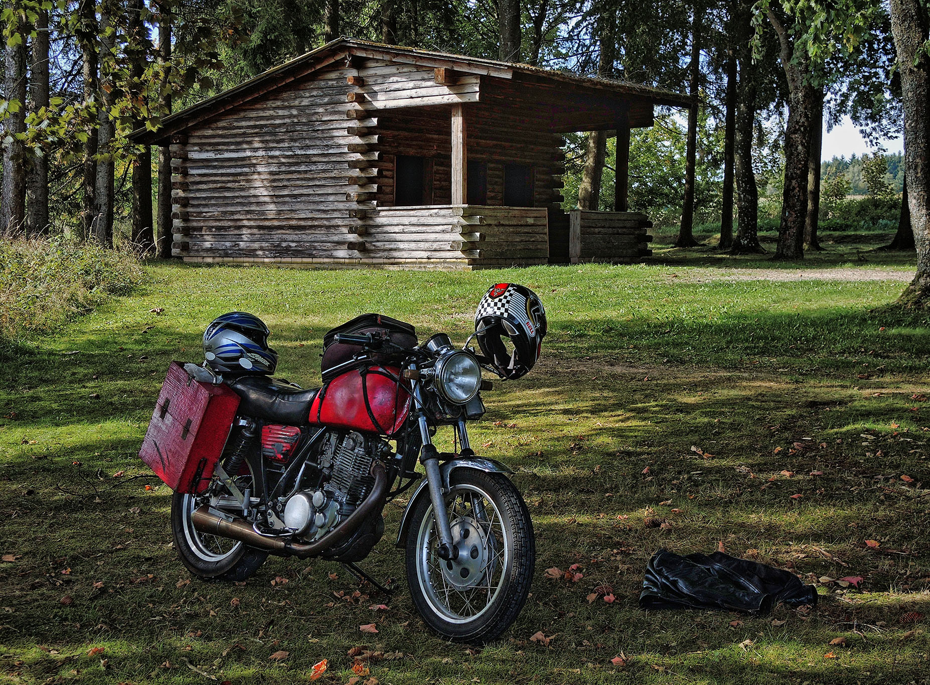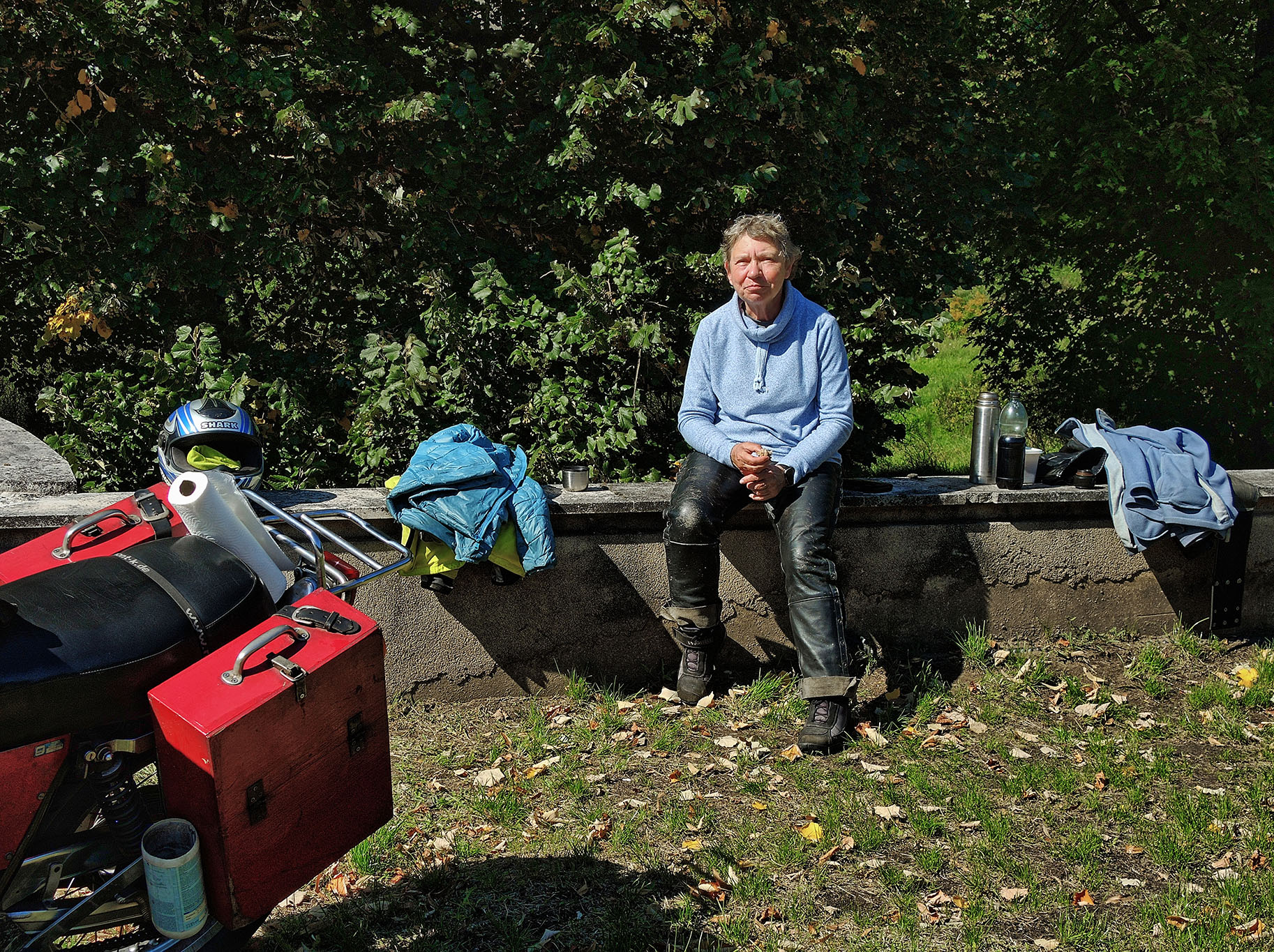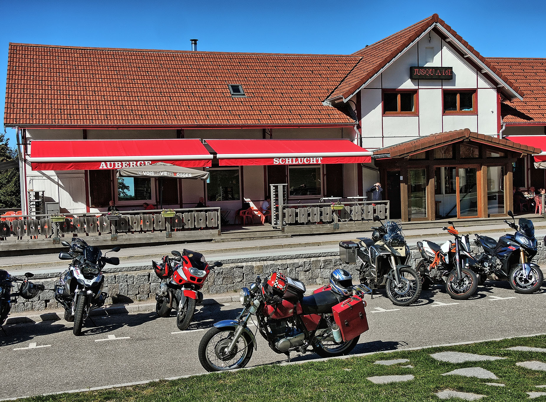 Die Meteorolügen hatten uns drei stabile Sonnentage vorhergesagt, also SR satteln und los. Durch die Südeifel an die Sauer, zur Mündung in die Mosel nach Wasserbilligerbrück. Der kürzeste Weg nach Süden führt über die Moselbrücke von Igel nach Konz, und diese Strecke ist mit einem Zweirad befahrbar, etwas für Pfadfinder. Die Saar hoch über Mettlach, Merzig, Saarlouis, dort nach Westen, Lothringen. St. Avold ist in der Stadtdurchfahrt ein Kniffel, denn wir nehmen nicht die ewig lange Umfahrung. Schilder nach Dieuze helfen da weiter. Dort ist der See von Lindre, grosse Fläche, zweigeteilt, im Sommer fällt der nördliche Teil trocken. Das ist insgesamt eine reizvolle Tümpelgegend mit freiem Fahren, wenig Verkehr, keine Passfotos. In Cirey sur Vezouse hatten wir ein total schnuckeliges airbnb für 2 Nächte, 2 Personen, zum insgesamt zweistelligen Preis, ein Glückstreffer, abseits vom Ort, mit Tisch hinterm Haus und Blick auf einen privaten Park. Am zweiten Tag sind wir ohne Gebäck in die Vogesen, zuerst die Weisse Saar hoch zum Donon. Die Weisse Saar ist eine Traumlandschaft, die Auenwiesen dampften, die silbrigen Birken glänzten und die Mufflons lagen gemütlich beim Morgenkaffee und kauten. Alexandra sagt dann immer: byrgerliche Schainidülle. Ostseite Donon in Schirmeck ist ein Intermarche mit Tanke, dort trifft sich alles, weil es weit und breit die beste Einkaufsmöglichkeit ist. Der Champ du Feu ist landschaftlich ein Traum, die changierende Farbe der Alpwiesen. Die Restauration des Turmes ist mehr als halb gemacht, aber es geht seit Jahren nicht weiter, von dort kann man quer über die Oberrheinebene tief in den Schwarzwald schauen. Col de la Charbonnière, Col de Steige, Col de la Salcée, Col d'Urbeis, Col de Mandray, Col du Bonhomme, Col de la Schlucht, grosser Auftrieb dort, Grand Ballon, Col Amic, runter ins Tal nach Westen, entlang des Sees von Wildenstein, Col du Bramont, la Bresse, Col de Grosse Pierre, Gerardmer mit dem See, weiter Nord nach St. Dié. Inzwischen hatten wir einen Knoten im Lenker und die Sonne rutschte tiefer, also am Kabel gezogen und 25km ausgebaute N59, das räumte, über Badenweiler zurück nach Cirey sur Vezouse. Wir waren platt, aber es hat gelohnt, der vorletzte Sommertag. Die Unterkunft hatte einen Kaminofen und der Patron stellte mächtig Holz hin, Danke. Am nächsten Morgen fix nochmal die Ventile nachgestellt, die in der Nachmittagssonne passhoch etwas tickerten, dazu brauchen wir nur noch 40min, bis alles auseinander und zusammen ist, einschliesslich Koffer und Tankrucksack, aber danach hatten wir ein besseres Gefühl und sie lief leiser. Über Abreschviller und das Schiffshebewerk "Plan incliné" nach Lützelburg, dort ist traditionell Rast an der Schleuse, der Zorn. Über Phalsbourg, Lützelstein, Bitsch, nach Pirmasens. Dort ist der Einstieg in die B270 nach Norden, eine geniale Strasse, mit Kurven, nicht zu eng, nicht zu gerade, fast ohne Ortsdurchfahrten, feine Landschaft, da rasen wir mit 90kmh an K-Town vorbei, über Lauterecken, Bruchweiler nach Morbach am Nordrand des Hochwaldes. Oben auf dem Weg nach Bernkastel machen wir immer Rast bei der Holzhütte mit den grossen Windrädern, total gemütlich, ruhig, wenig bekannt. Moselabwärts bis Ürzig, dort kommt die Auffahrt in die Eifel, eine Strasse wie Freiwandklettern, gips nicht oft in D-Land. Die B421 trug uns nach Daun, Kelberg, Nürburgring, Adenau, Bad Münstereifel und dann nach Hause, wo wir den Strassenstaub mit ordentlich Flaschbier besiegen konnten. Insgesamt waren das ca 1100 km, die SR verbrauchte 4 1/4 Liter Benzin und gesamt 0,45 l Öl, elf 20W50 Cruise mit 25% Beimischung Liqui Moly SAE50 Classic, das läuft schön leise. Unsere Dame kommt in die Jahre, ein Knuff hier, eine Schraube dort, aber insgesamt gibt sie ein Gefühl auf dem Moppi, welches mir bisher kein anderes Moppi gegeben hat. Die Tatsache, dass wir zwei Senioren da 7 Stunden mit Freude drauf sitzen können, spricht dafür. Wir wissen nie, was die Zukunft bringt, dieses Wetterfenster wollten wir mitnehmen. Grüsse aus der Eifel A & m |