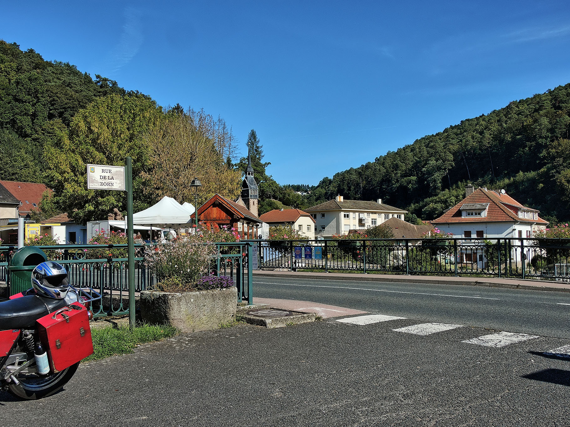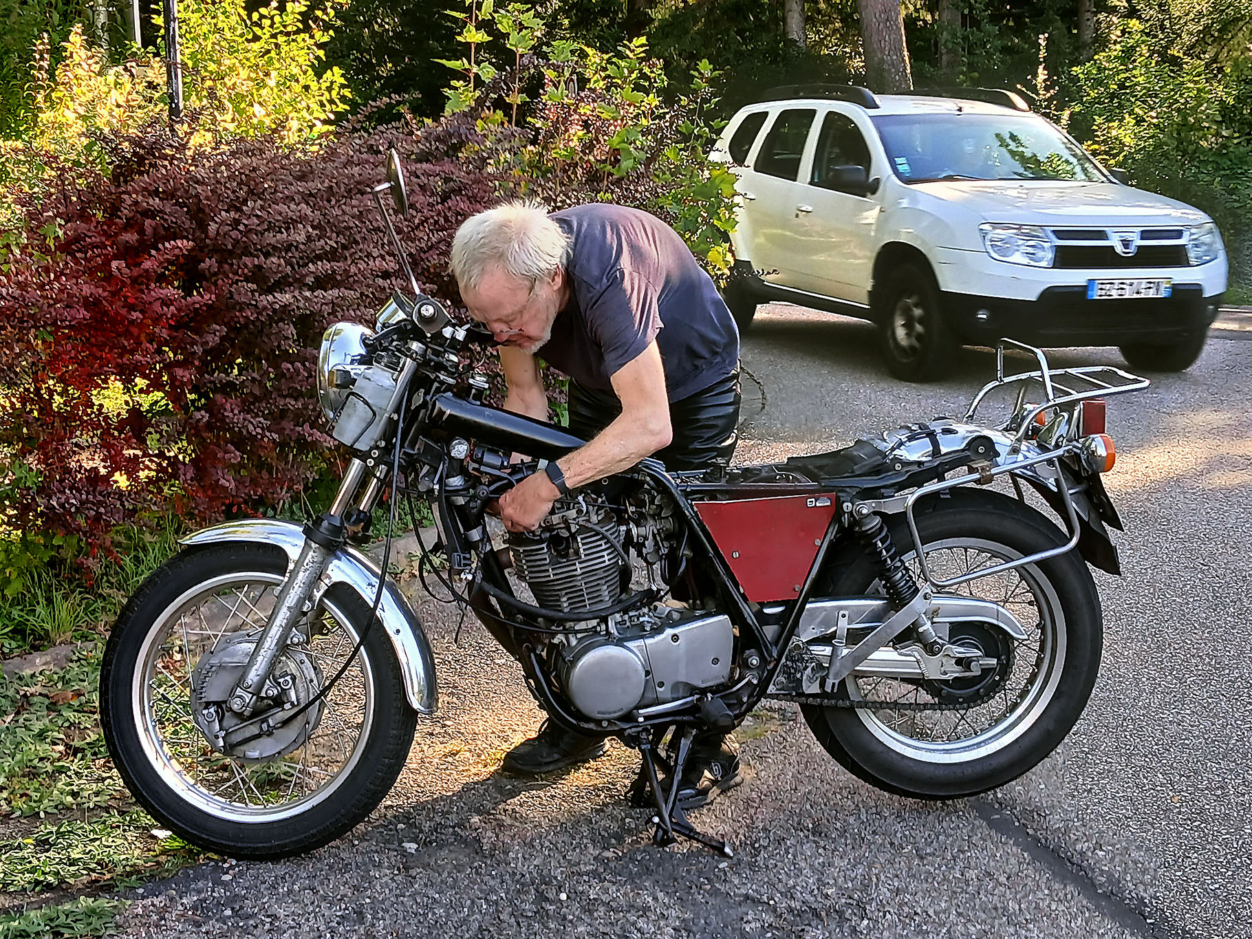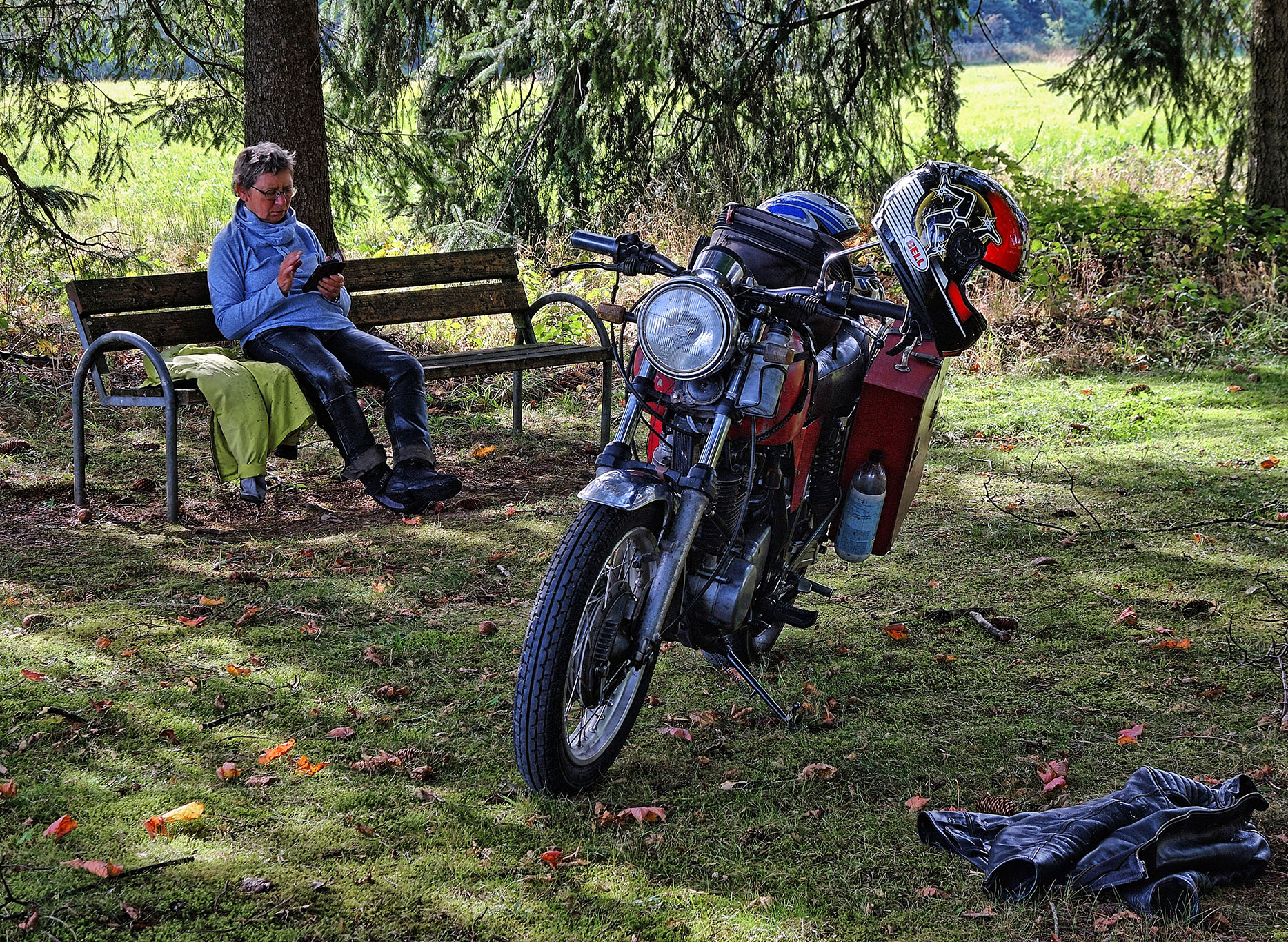 Die Meteorolügen hatten uns drei stabile Sonnentage vorhergesagt, also SR satteln und los. Durch die Südeifel an die Sauer, zur Mündung in die Mosel nach Wasserbilligerbrück. Der kürzeste Weg nach Süden führt über die Moselbrücke von Igel nach Konz, und diese Strecke ist mit einem Zweirad befahrbar, etwas für Pfadfinder. Die Saar hoch über Mettlach, Merzig, Saarlouis, dort nach Westen, Lothringen. St. Avold ist in der Stadtdurchfahrt ein Kniffel, denn wir nehmen nicht die ewig lange Umfahrung. Schilder nach Dieuze helfen da weiter. Dort ist der See von Lindre, grosse Fläche, zweigeteilt, im Sommer fällt der nördliche Teil trocken. Das ist insgesamt eine reizvolle Tümpelgegend mit freiem Fahren, wenig Verkehr, keine Passfotos. In Cirey sur Vezouse hatten wir ein total schnuckeliges airbnb für 2 Nächte, 2 Personen, zum insgesamt zweistelligen Preis, ein Glückstreffer, abseits vom Ort, mit Tisch hinterm Haus und Blick auf einen privaten Park. Am zweiten Tag sind wir ohne Gebäck in die Vogesen, zuerst die Weisse Saar hoch zum Donon. Die Weisse Saar ist eine Traumlandschaft, die Auenwiesen dampften, die silbrigen Birken glänzten und die Mufflons lagen gemütlich beim Morgenkaffee und kauten. Alexandra sagt dann immer: byrgerliche Schainidülle. Ostseite Donon in Schirmeck ist ein Intermarche mit Tanke, dort trifft sich alles, weil es weit und breit die beste Einkaufsmöglichkeit ist. Der Champ du Feu ist landschaftlich ein Traum, die changierende Farbe der Alpwiesen. Die Restauration des Turmes ist mehr als halb gemacht, aber es geht seit Jahren nicht weiter, von dort kann man quer über die Oberrheinebene tief in den Schwarzwald schauen. Col de la Charbonnière, Col de Steige, Col de la Salcée, Col d'Urbeis, Col de Mandray, Col du Bonhomme, Col de la Schlucht, grosser Auftrieb dort, Grand Ballon, Col Amic, runter ins Tal nach Westen, entlang des Sees von Wildenstein, Col du Bramont, la Bresse, Col de Grosse Pierre, Gerardmer mit dem See, weiter Nord nach St. Dié. Inzwischen hatten wir einen Knoten im Lenker und die Sonne rutschte tiefer, also am Kabel gezogen und 25km ausgebaute N59, das räumte, über Badenweiler zurück nach Cirey sur Vezouse. Wir waren platt, aber es hat gelohnt, der vorletzte Sommertag. Die Unterkunft hatte einen Kaminofen und der Patron stellte mächtig Holz hin, Danke. Am nächsten Morgen fix nochmal die Ventile nachgestellt, die in der Nachmittagssonne passhoch etwas tickerten, dazu brauchen wir nur noch 40min, bis alles auseinander und zusammen ist, einschliesslich Koffer und Tankrucksack, aber danach hatten wir ein besseres Gefühl und sie lief leiser. Über Abreschviller und das Schiffshebewerk "Plan incliné" nach Lützelburg, dort ist traditionell Rast an der Schleuse, der Zorn. Über Phalsbourg, Lützelstein, Bitsch, nach Pirmasens. Dort ist der Einstieg in die B270 nach Norden, eine geniale Strasse, mit Kurven, nicht zu eng, nicht zu gerade, fast ohne Ortsdurchfahrten, feine Landschaft, da rasen wir mit 90kmh an K-Town vorbei, über Lauterecken, Bruchweiler nach Morbach am Nordrand des Hochwaldes. Oben auf dem Weg nach Bernkastel machen wir immer Rast bei der Holzhütte mit den grossen Windrädern, total gemütlich, ruhig, wenig bekannt. Moselabwärts bis Ürzig, dort kommt die Auffahrt in die Eifel, eine Strasse wie Freiwandklettern, gips nicht oft in D-Land. Die B421 trug uns nach Daun, Kelberg, Nürburgring, Adenau, Bad Münstereifel und dann nach Hause, wo wir den Strassenstaub mit ordentlich Flaschbier besiegen konnten. Insgesamt waren das ca 1100 km, die SR verbrauchte 4 1/4 Liter Benzin und gesamt 0,45 l Öl, elf 20W50 Cruise mit 25% Beimischung Liqui Moly SAE50 Classic, das läuft schön leise. Unsere Dame kommt in die Jahre, ein Knuff hier, eine Schraube dort, aber insgesamt gibt sie ein Gefühl auf dem Moppi, welches mir bisher kein anderes Moppi gegeben hat. Die Tatsache, dass wir zwei Senioren da 7 Stunden mit Freude drauf sitzen können, spricht dafür. Wir wissen nie, was die Zukunft bringt, dieses Wetterfenster wollten wir mitnehmen. Grüsse aus der Eifel A & m |