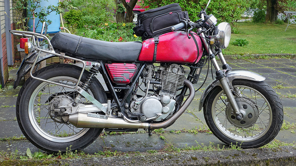 Natürlich mit dem Original angefangen, ein guter und schöner Auspuff. Er ist anerkannt für Leistung und geringes, aber angenehmes Geräusch. In den wilden Jahren gehört es zum guten Ton, andere Püffer auszuprobieren, bei mir auch. Die BSA-Zigarre war enttäuschend, zu laut, Drehmomentloch in der Drehzahlmitte. Irgendwann sah ich in Köln neben mir an der Ampel eine SR mit einem sehr schönen Auspuff, mit einem guten Klang. Ich fragte den Treiber: was isn dös? Er sagte: Sito universal vom Heini. Meines Wissens ist der Universal bevorzugt auf Guzzi V2 abgestimmt. Hingefahren, gekauft, 125 Mark! Der Sito fährt wie original, ist geringfügig lauter, aber hat drei Vorteile: